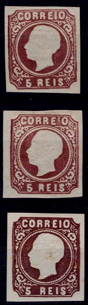 1431 imagePortugal 1862-64 D. Luís I. 3 stamps of MF#14, 5 réis brown, on smooth, undented paper with 3 different dies: die 1, die 2 and die 3. New copies, ungummed, with normal to short margins and good color. Catalogue value €310.(Image 1)