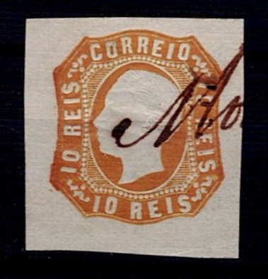 1432 imagePortugal 1862-64 – D. Luís I, Borja Freire. Mf#15, 10 reis, orange yellow, on smooth paper. Copy used for probable tax purposes, with a small hole in the "1" of "10 reis", with good colour and relief, with luxury to good margins. Catalogue value €85 .(Image 1)
