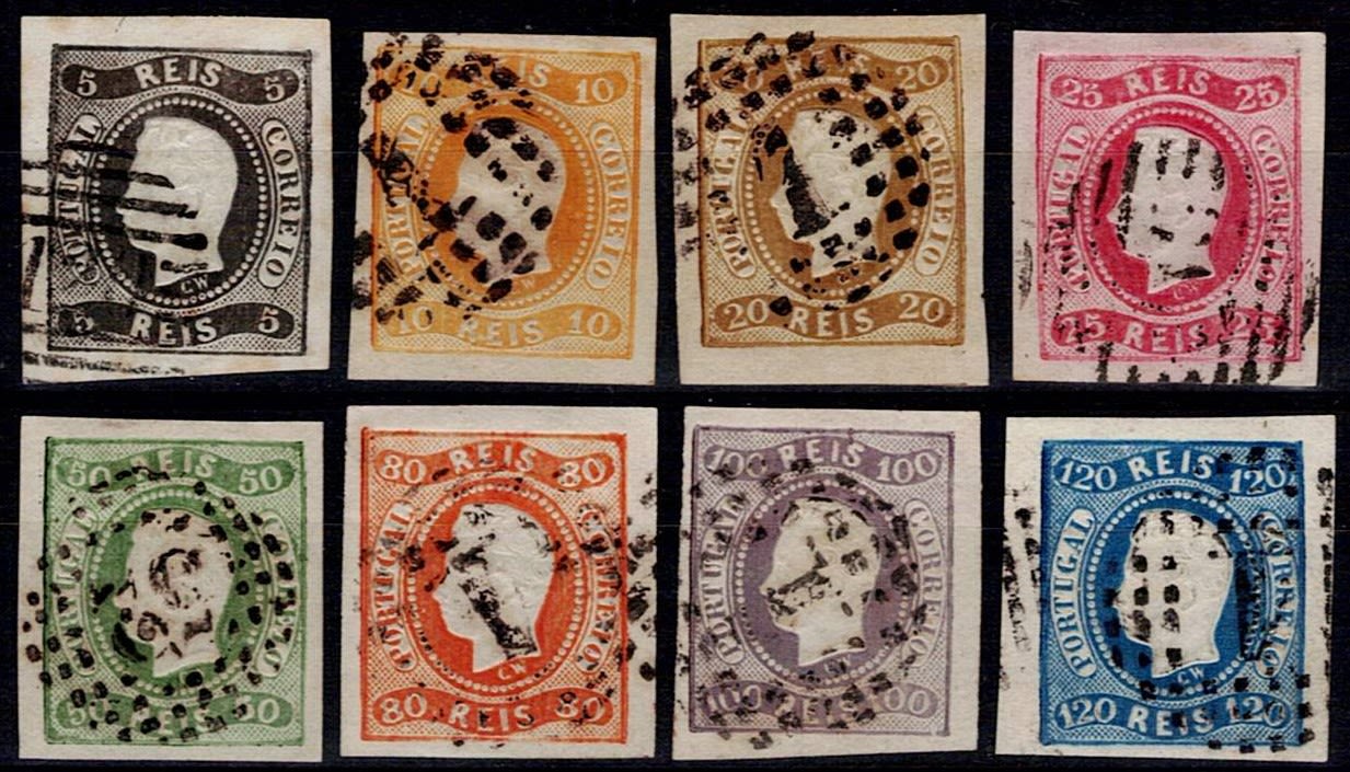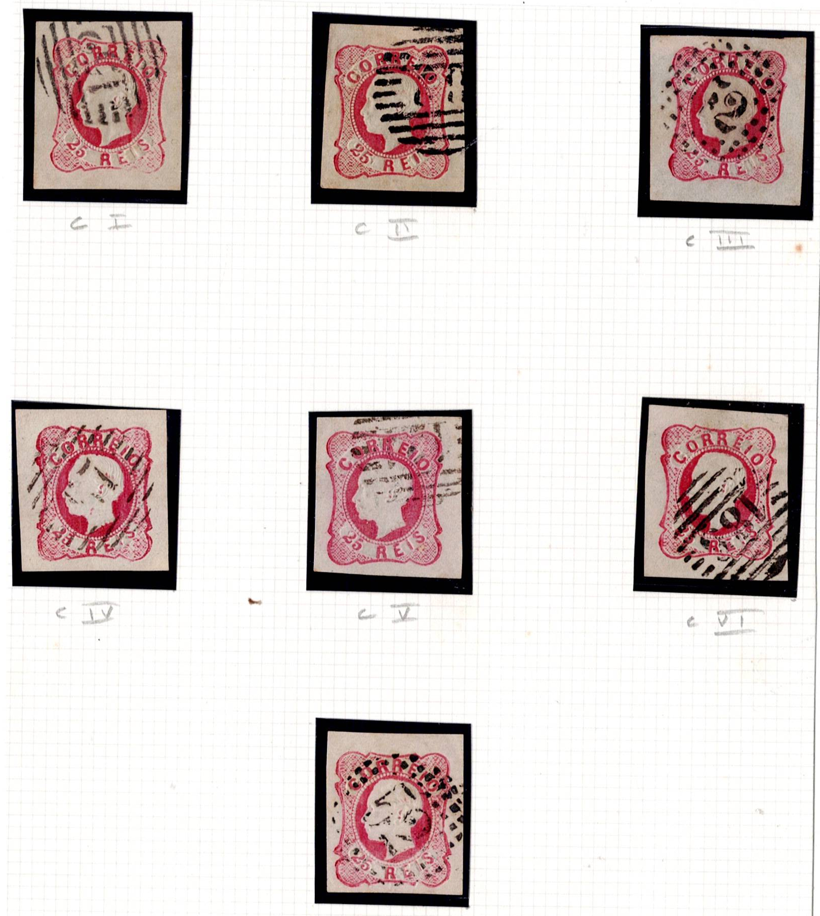 1434 imagePortugal 1862-64 D. Luis, Borja Freire. Complete series of imprints I to VII of stamp Mf#15, 25 reis carmine pink on used stamps with light/well-beaten first reform postmarks of dots or bars. Stamps with normal to wide margins, in good color.(Image 1)