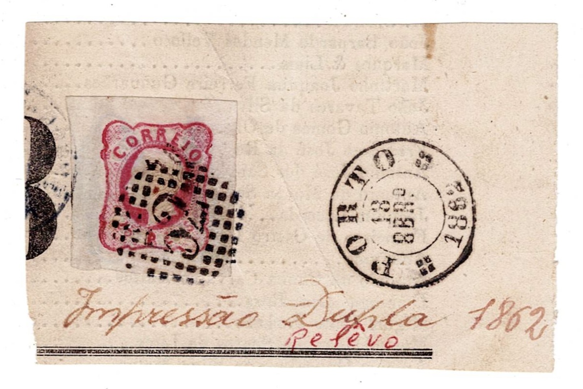 1435 imagePortugal. Issue D. Luis I, 1862/64. Fragment of newspaper or printed matter, sent from Porto on 18.10.1862, franking of 25 reis rosa, WITH DOUBLE PRINTING OF THE RELIEF, Mf#16g (catalogue value €1400 for used stamp), and Luxury margins, 52 dot stamp obliterating the stamp(Image 1) (Image 2)