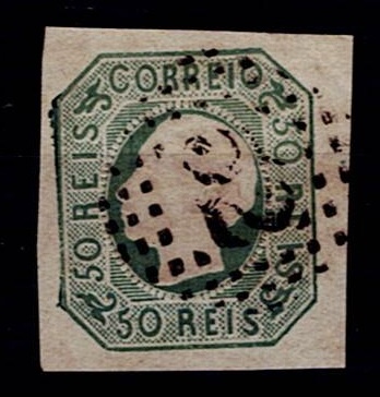 1436 imagePortugal 1862-64 D. Luis, Borja Freire. Stamp Mf#17a, 50 reis green blue smooth paper without notches. Used copy with good to short margins, in good color, without defects or repairs. Catalogue value € 185 .(Image 1)