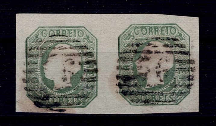 1437 imagePortugal 1862-64 – D. Luís I, Borja Freire. Horizontal PAIR of Mf#17a, 50 reis, GREEN BLUE, on smooth paper. Used copies, normal to good margins, obliterated with a 4-3-4 type stamp struck in black “56 - Braga”. Catalogue value € 550 .(Image 1)