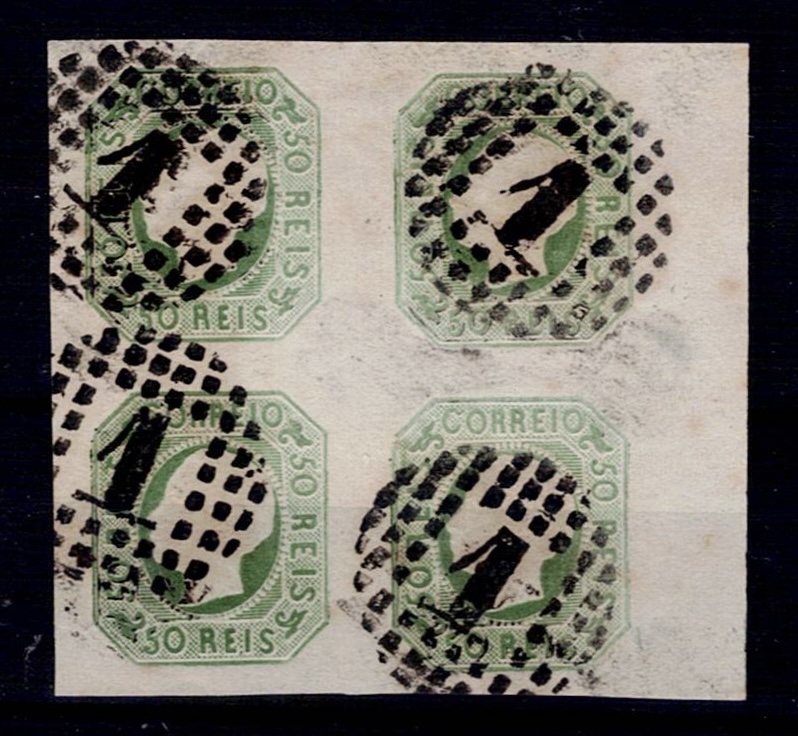 1438 imagePortugal 1862-64 – D. Luís I, Borja Freire. QUADRA leaf edge of Mf#17, 50 reis green, on smooth paper. Used copies, with 2 thinnings and 1 repair on the 4th seal, obliterated with a black dotted stamp “1 - Lisbon”. Catalogue value € 1,120.(Image 1)