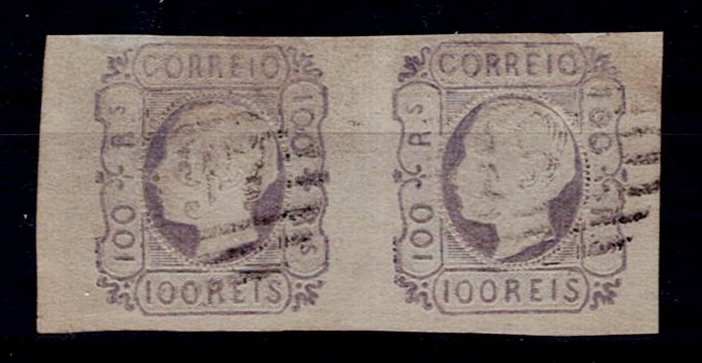 1439 imagePortugal 1862-64 – D. Luís I, Borja Freire. HORIZONTAL PAIR of Mf#18, 100 réis, lilac, on smooth paper. Used copies, with very good to short margins, thinned at the top left of the 1st stamp, with a horizontal crease on the 1st stamp, obliterated with an illegible black 4-3-4 stamp. Catalogue value €495.(Image 1)