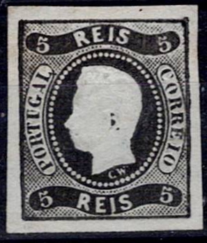 1440 imagePortugal 1866-67 D. Luis I, curved ribbon, not indented. Stamp Mf#19, 5 reis black, not indented. New stamp without gum and normal margins, with 2 ink spots on the ear. Catalog value €90.(Image 1)