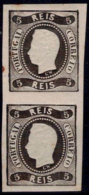1441 imagePortugal 1866-67 D. Luis I, curved ribbon without indentations. Vertical PAIR of stamp Mf#19, 5 reis black, imprint I without indentations. New stamps with original gum and hinge mark on both stamps and oxide spots, with good margins. Catalogue value € 400 .(Image 1)
