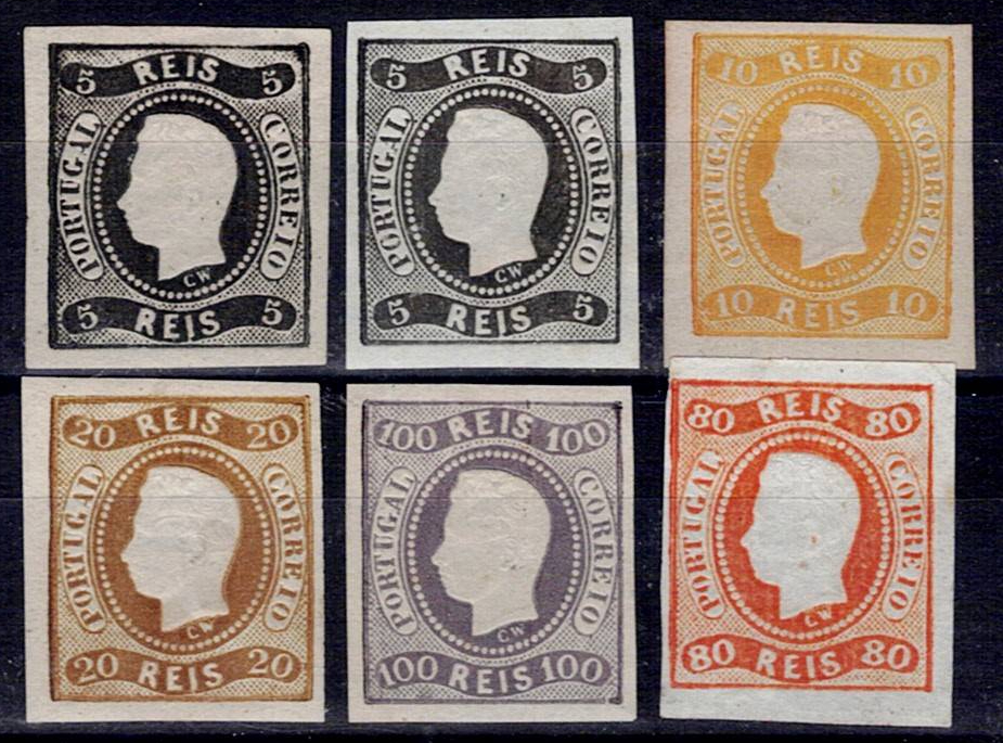 1442 imagePortugal 1866-1867 D. Luis I, curved ribbon without notches. Set of 6 stamps Mf#19, 10 Reis in black and black-gray, Mf#20, 10 reis yellow, Mf#21, 20 reis bistre, Mf#24, 80 reis orange and Mf#25a (type 1a) 100 reis lilac mauve. New copies, ungummed, in good color, with normal to wide margins except for the left margin of the 80 reis. Catalogue value €1,140.(Image 1)