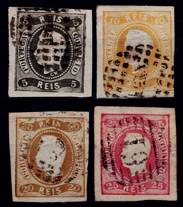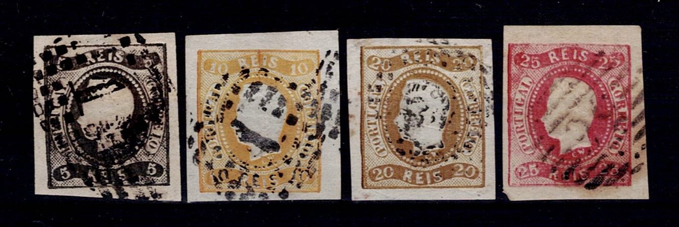 1443 imagePortugal 1866/67 – D. Luís I. Curved ribbon, not serrated. 4 stamps Mf#19-22, 5 to 25 reis, smooth paper, not serrated. Used copies, with good colour, obliterated with 1st reform stamps struck in black. Catalogue value € 417 .(Image 1)