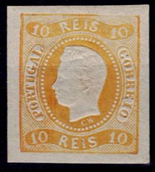 1446 imagePortugal 1866-67 D. Luis I, curved ribbon, not indented. Stamp Mf#20, 10 reis yellow, not indented. New stamp with non-original gum, with 4 wide margins. Catalogue value € 420 .(Image 1)