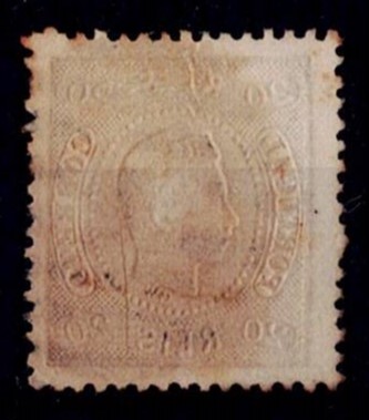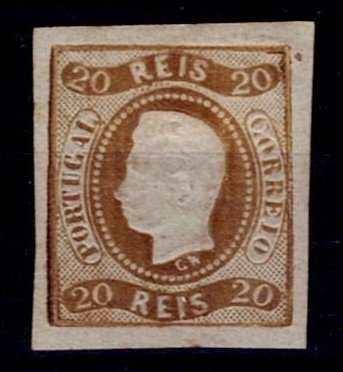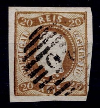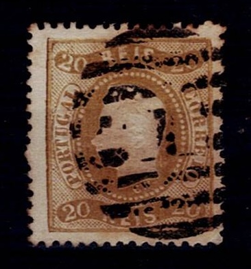 1465 imagePortugal 1867/70 – D. Luís I. Curved ribbon, serrated. Mf#29, 20 reis, bistre, smooth paper, serrated. Used copy, with traces of oxid in the perforations, with good colour and relief, with bar stamp from the 2nd reform. Catalogue value € 195 .(Image 1) (Image 2)