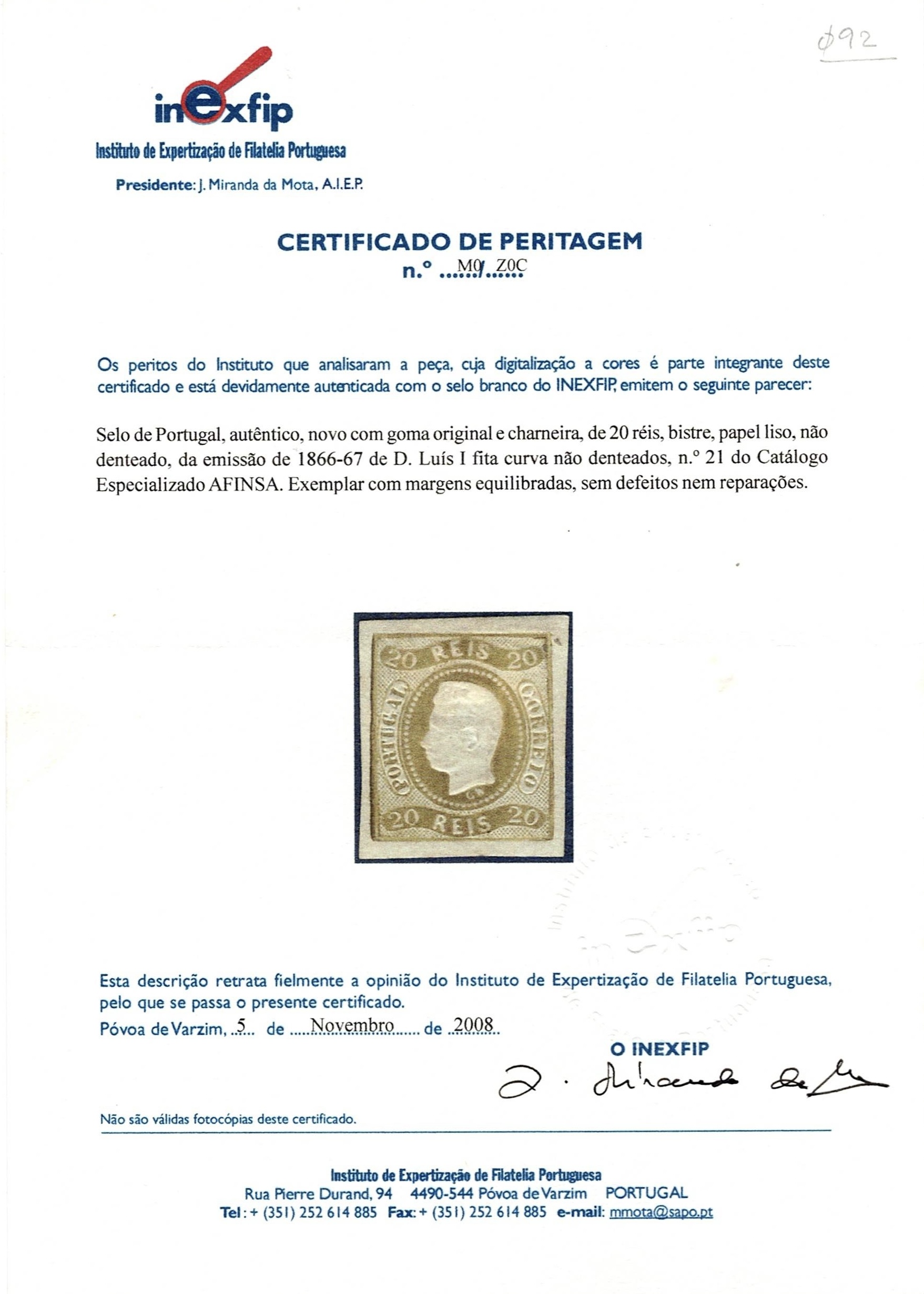 1447 imagePortugal 1866-67 – D. Luís I, curved ribbon without notches. Mf#21, 20 réis, bistre, on smooth paper. New copy, with balanced margins, with original gum and hinge, without defects or repairs. Catalogue value €350. With Inexfip certificate.(Image 1) (Image 2)