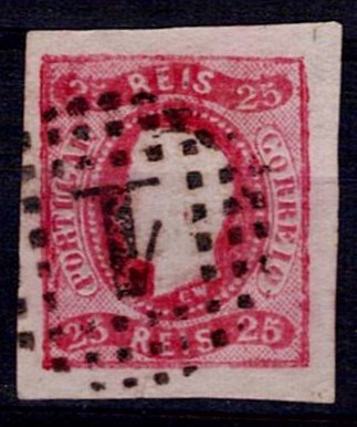 1449 imagePortugal 1866/67 D. Luís I. Curved ribbon, not serrated. MF22, 25 réis, with SLIGHT REPAINTING, pink, smooth paper, not serrated. Used copy, without defects or repairs, with good to short margins.(Image 1)