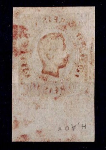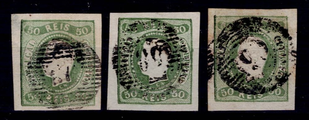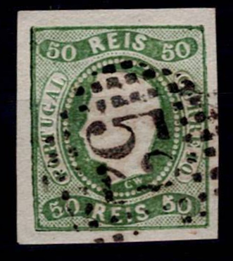 1450 imagePortugal 1862-64 – D. Luís I, curved ribbon, not perforated. Stamp Mf#23, 50 reis green, on smooth, not perforated paper. Used copy, normal to good margins, obliterated with a black dot stamp “52 - Porto”. Catalogue value €120.(Image 1)