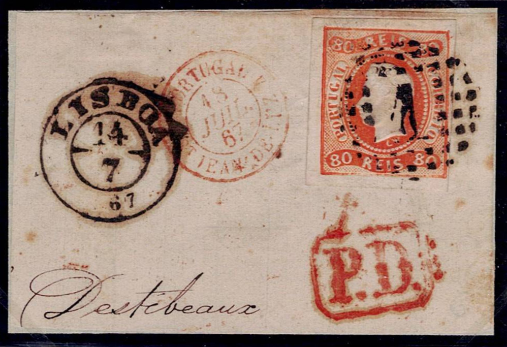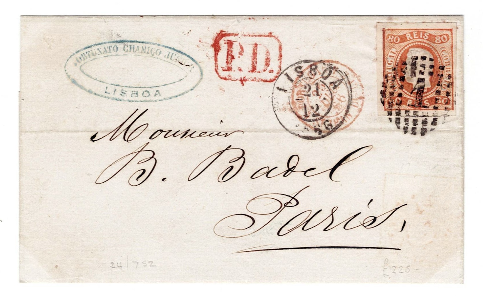 1452 imagePostal history Portugal France. 1866. Envelope sent from Lisbon on 21.12.1866, postage of 80 reis, curved ribbon without notches, unusable dotted stamp 1, to Paris, entry mark PORTUGAL/ 25 DEC 1866/S. JEAN DE LUZ, in red, arrival in Paris on 26.12. PD mark indicating that postage had been paid to the destination(Image 1) (Image 2)