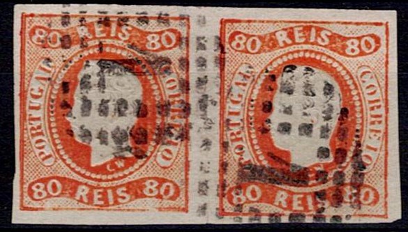 1454 imagePortugal 1866/67 D. Luís I. Curved ribbon, not serrated. PAIR of MF24, 80 réis, orange, smooth paper, not serrated. Used copies, without defects or repairs, with normal to short margins, obliterated with a black stamp "1 - LISBOA". Catalogue value € 360 .(Image 1)