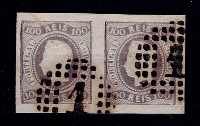 1457 imagePortugal 1866/67 – D. Luís I. Curved ribbon, not serrated. HORIZONTAL PAIR of Mf#25a, 100 réis, mauve lilac, smooth paper, not serrated, type Ia. Used copies, without defects or repairs, with good margins, with dot stamp from the 1st reform "1 - Lisbon". Catalogue value € 540 .(Image 1)
