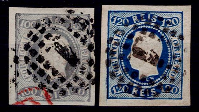 1458 imagePortugal 1862-64 – D. Luís I, curved ribbon, not perforated. Set of 2 stamps Mf#25-26, 100 and 120 reis, on smooth paper, not perforated. Used copies, normal to good margins, obliterated with a black dot stamp "1 - Lisbon". Catalogue value €340.(Image 1)