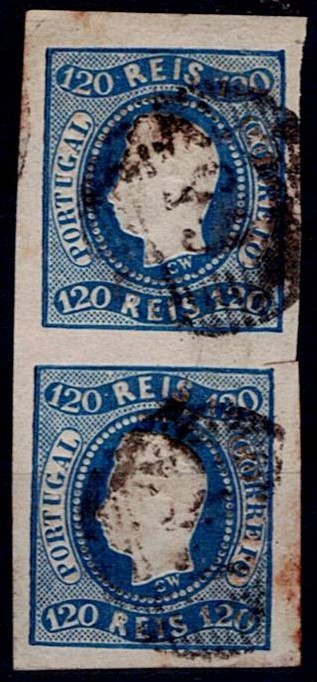 1459 imagePortugal 1866/67 D. Luís I. Curved ribbon, not serrated. PAIR of MF26, 120 réis, blue, smooth paper, not serrated. Used copies, with a small horizontal cut between 2 stamps not affecting the frame of either, without repairs, with 4 good margins, obliterated with a black stamp "65 - MONDIM DE BASTO". Catalogue value € 390 .(Image 1)