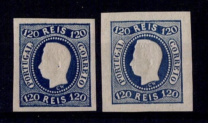 1460 imagePortugal 1866/67 – D. Luís I. Curved ribbon, not serrated. 2 FAKE ITALIAN STAMPS of stamp Mf#26, 120 réis, blue, smooth paper, not serrated - one WITH CLEAR HAIR and one WITHOUT CLEAR HAIR. New FAKE copies, with gum and without hinge, without defects or repairs. FAKE.(Image 1)