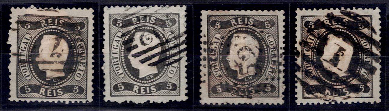 1462 imagePortugal. D. Luis curved ribbon perforated. Set of 4 stamps of 5 reis, from 4 different dies.(Image 1)