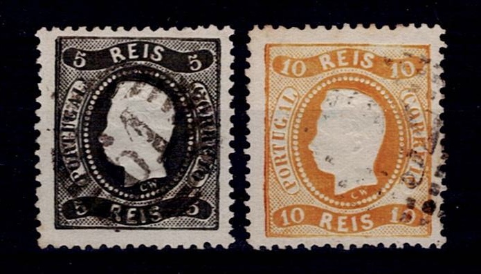 1463 imagePortugal 1867/70 – D. Luís I. Curved ribbon, serrated. 2 stamps Mf#27-28, 5 and 10 reis, smooth paper, serrated. Used copies, with good colour and relief. Catalogue value €270.(Image 1)