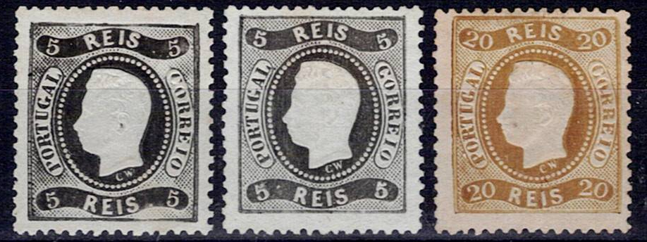 1464 imagePortugal 1867-70 D. Luís I, curved ribbon with notches. Set of 3 stamps Mf#27, 10 Reis in black and black-gray, Mf#29, 20 Reis bistre. New copies, ungummed, with good color, the 20 Reis with oxide spots. Catalog value €430.(Image 1)