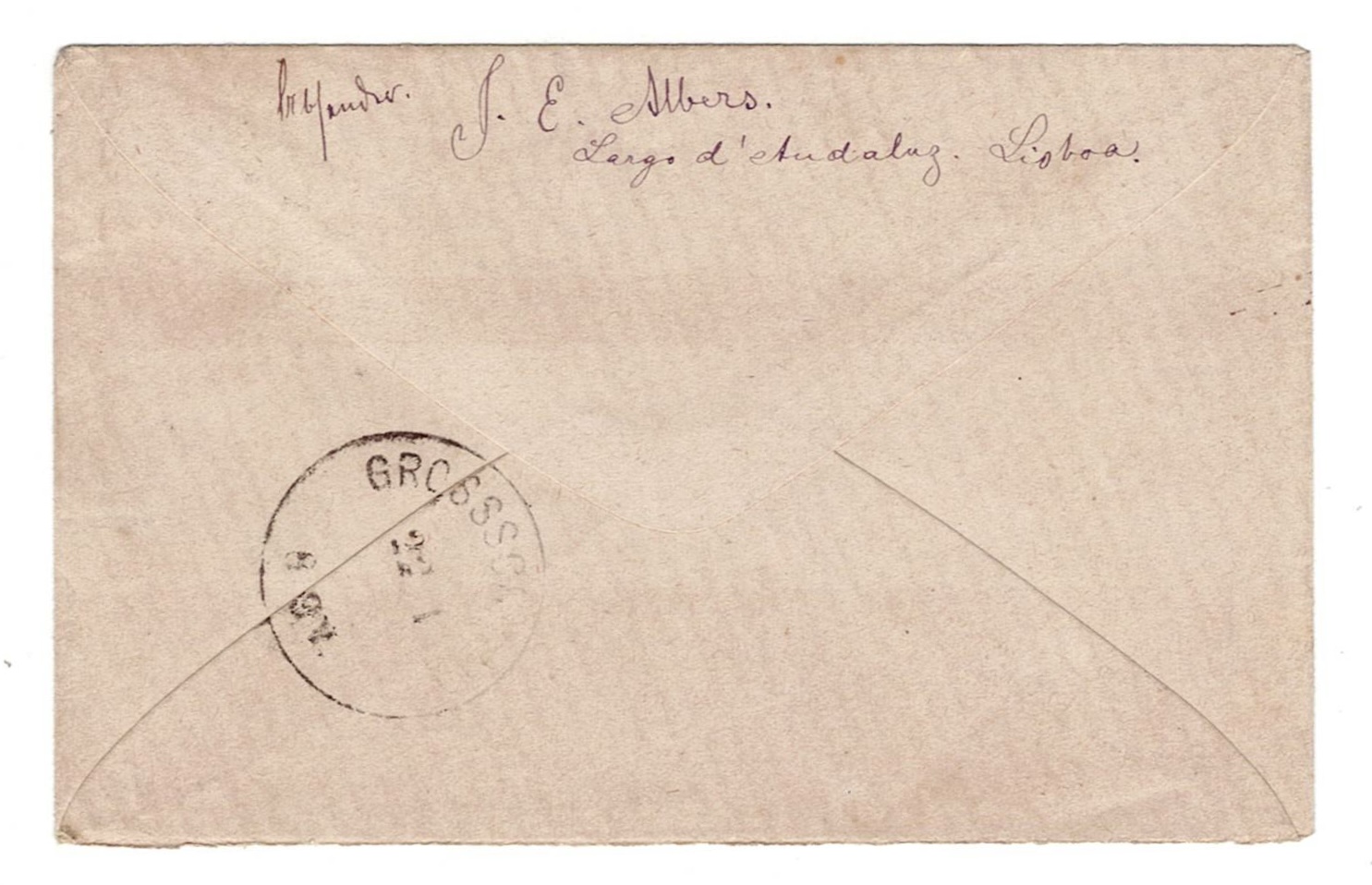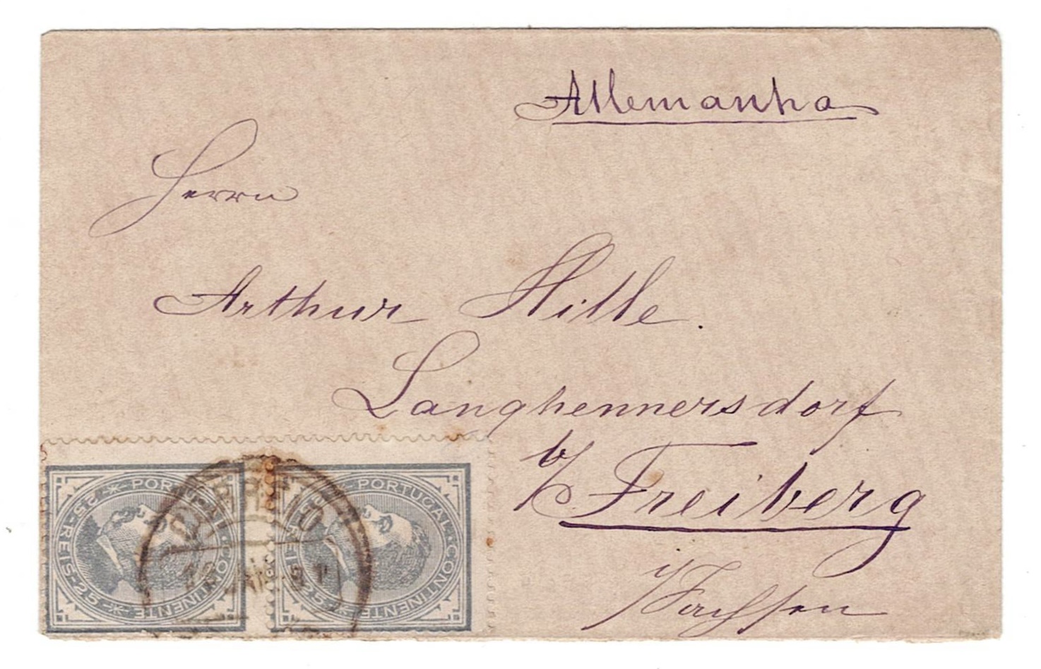 1506 imagePostal history Portugal Germany.1881. Letter sent from Lisbon on 19 January 1881, postage of 50 reis, pair of 25 reis grey, D. Luis in profile, to Freiberg, in Germany where it arrived on 22 January 1881.(Image 1) (Image 2)