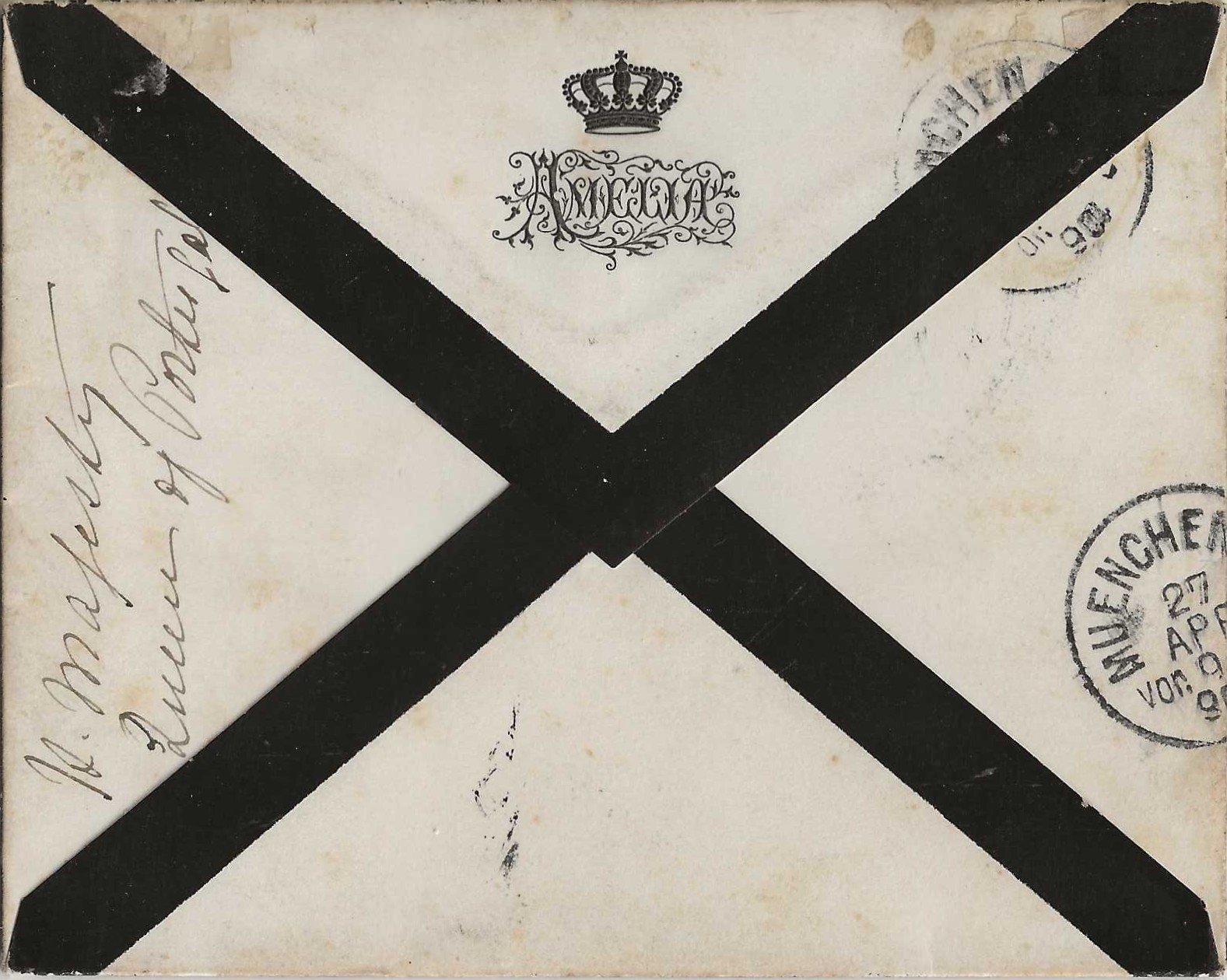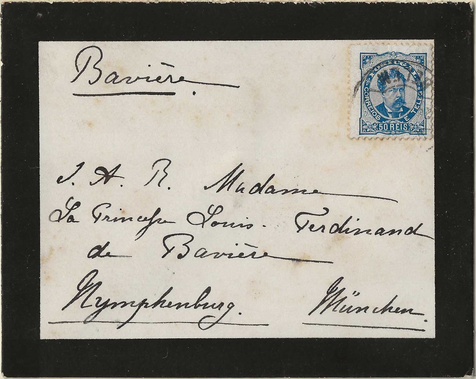 1507 imagePortugal * 1882/83 – D. Luís I. Front view. MF58, 50 réis, blue, porcelain paper, 11 ¾ perforation. Stamp in envelope with Queen D. Amélia's letterhead, circulated from Belém (23.04.90) to Prince Ferdinand of Bavaria in Munich (27.04.90).(Image 1) (Image 2)