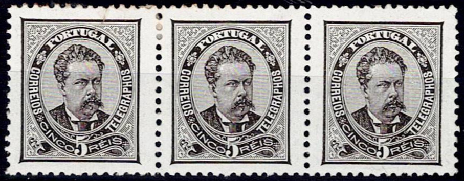 1508 imagePortugal 1884-87 D. Luís de frente, new values. Strip of 3 stamps Mf#60, 5 black, on porcelain paper, perforation 11 3/4. New copies, 1 stamp with original gum and WITHOUT hinge + 2 stamps with hinge (1 of them with a tear on the upper edge), with very good color. Catalog value € 90.(Image 1)