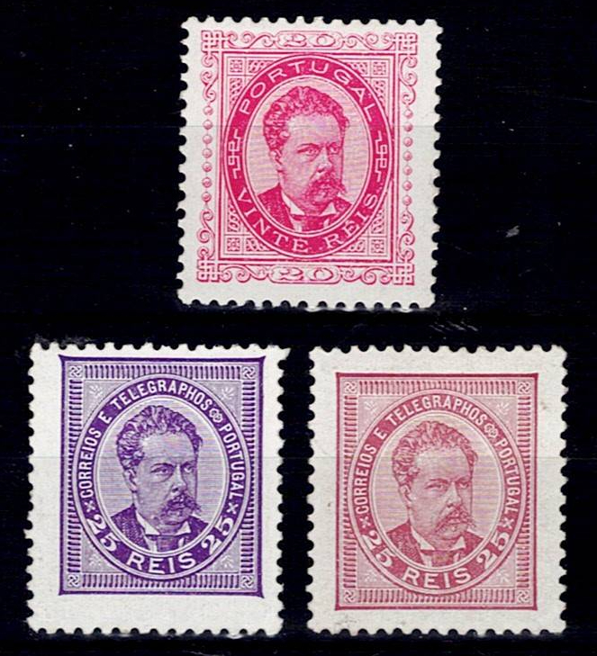 1510 imagePortugal 1884-87 D. Luís de frente, new values. Set of 3 stamps Mf#62, 20 pink reis + Mf#63, 25 reis in two colors: blue violet and pink lilac, on porcelain paper, perforation 11 3/4. New copies, gummed and hinged, in very good color, without defects or repairs. Catalog value €178.(Image 1)
