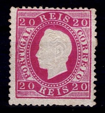 1511 imagePortugal 1884 D. Luis I, straight ribbon, new color. Stamp Mf#66, 20 reis carmine pink, porcelain paper, perforation 12 3/4. New copy, with non-original gum and traces of oxide, with repaired cut, with good color and relief. Catalog value €270.(Image 1)