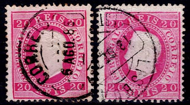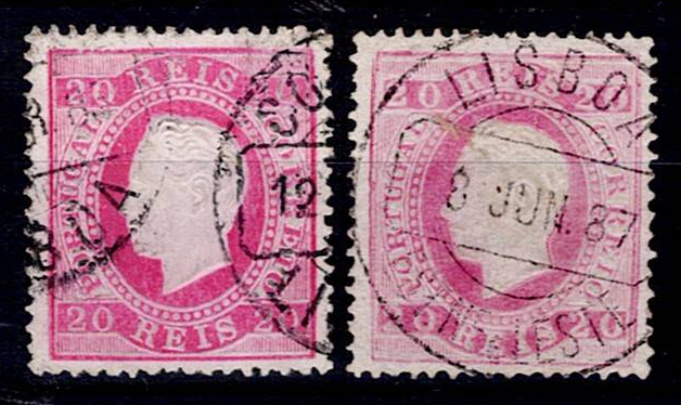 1512 imagePortugal 1884 D. Luis I, straight ribbon, new color and new value. 2 stamps Mf#66, 20 reis carmine pink, porcelain paper, perforation 12 3/4, with 2 dies VI and VII. Used stamps. Catalog value €198.(Image 1)