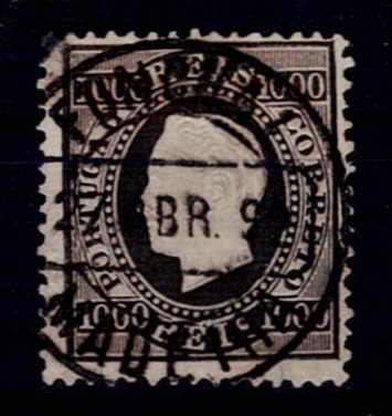 1514 imagePortugal 1884 – D. Luís I. Straight ribbon, NEW VALUE. MF67, 1,000 réis, black, 12 3/4 notch. Used copy, with good colour and relief, without defects or repairs, obliterated with a circular stamp dated FUNCHAL - MADEIRA. Very well beaten. Catalogue value € 185.(Image 1)