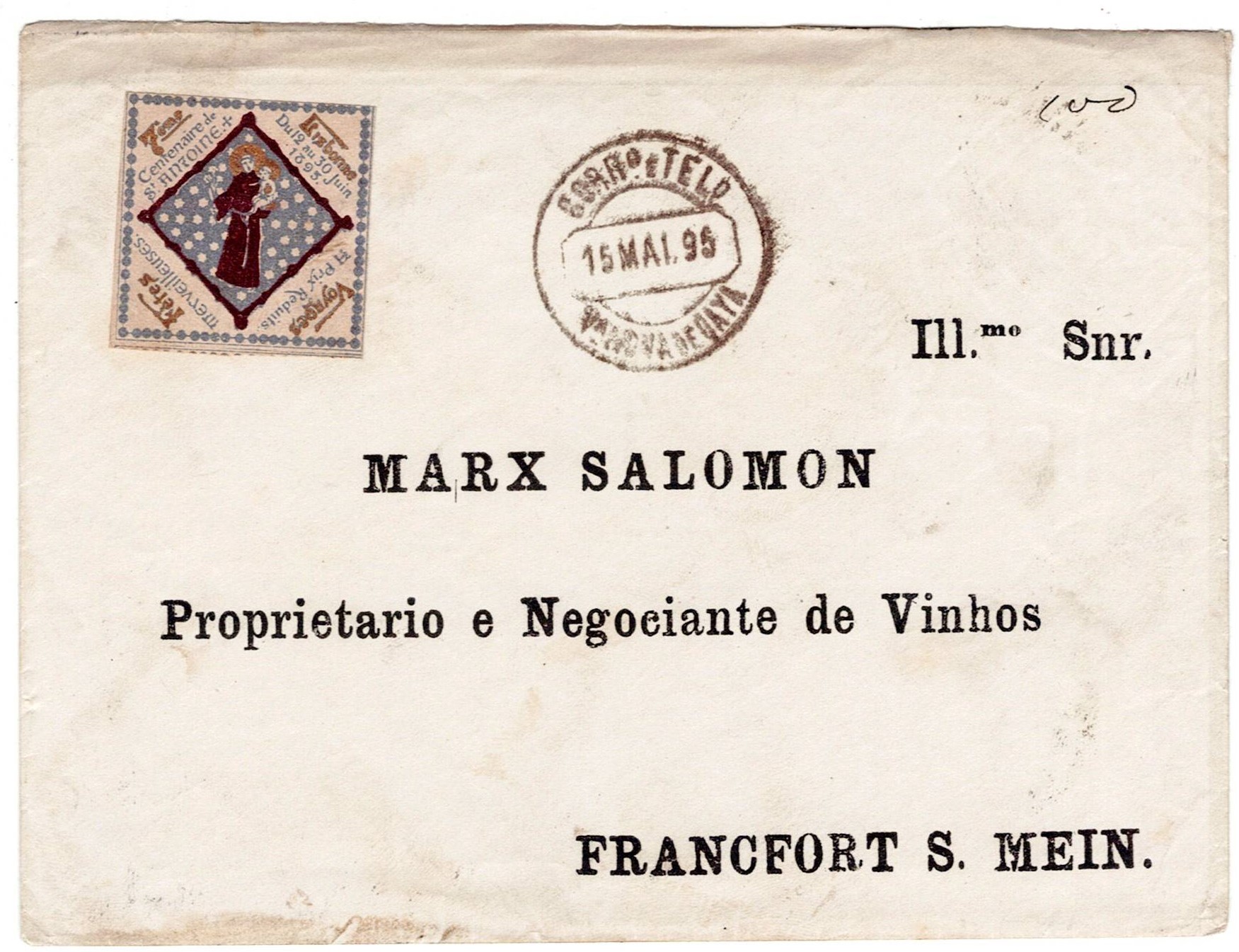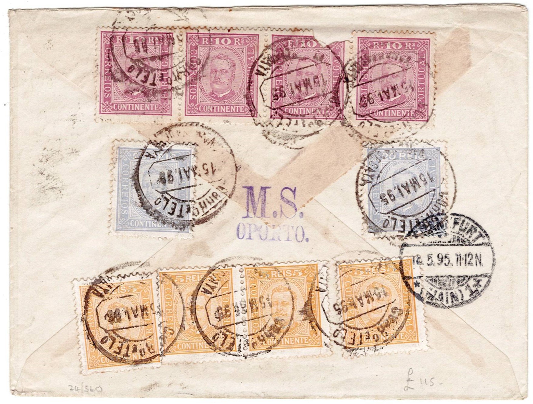 1515 imagePostal history Portugal Germany. 1895. Letter sent from Vª Nª de Gaya on 15.9.1895, postage of 100 reis, consisting of a strip of 4 of 10 reis (one defective stamp), 4 stamps of 5 reis (one pair and two isolated) and 2 stamps of 20 reis from the issue of D. Carlos de frente, arrival on 18.5.(Image 1) (Image 2)