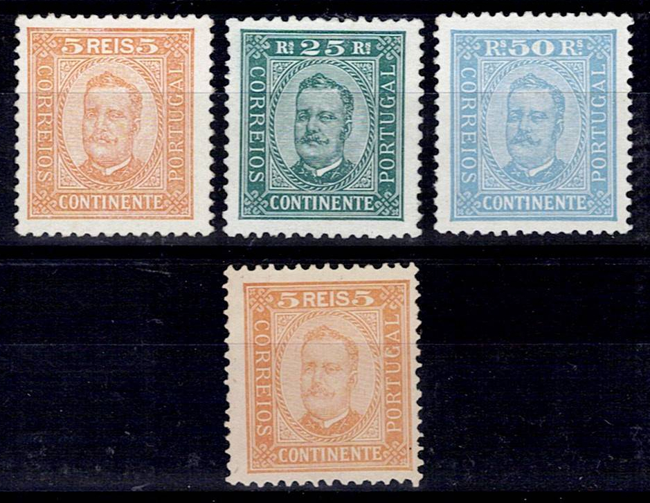 1516 imagePortugal 1892-1893 D. Carlos, Diogo Neto type. Set of 4 stamps Mf#68+70+71, 5, 25 and 50 reis on porcelain paper + Mf#68, of 5 reis on dotted paper, all in 11 3/4 perforation. New copies, without gum, with good color.(Image 1)