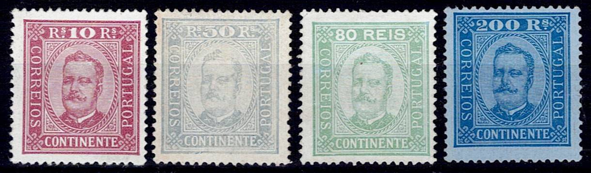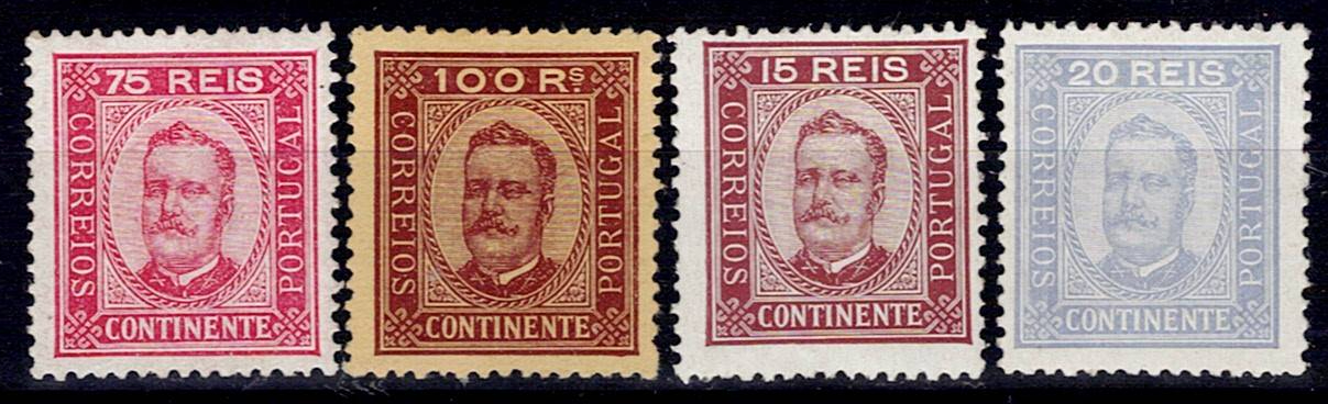 1517 imagePortugal 1892-1893 D. Carlos, Diogo Neto type. Set of 4 stamps Mf#69b+71b+76a+78a, all on porcelain paper and perforation 13.5. New copies, without gum, with good color.(Image 1)