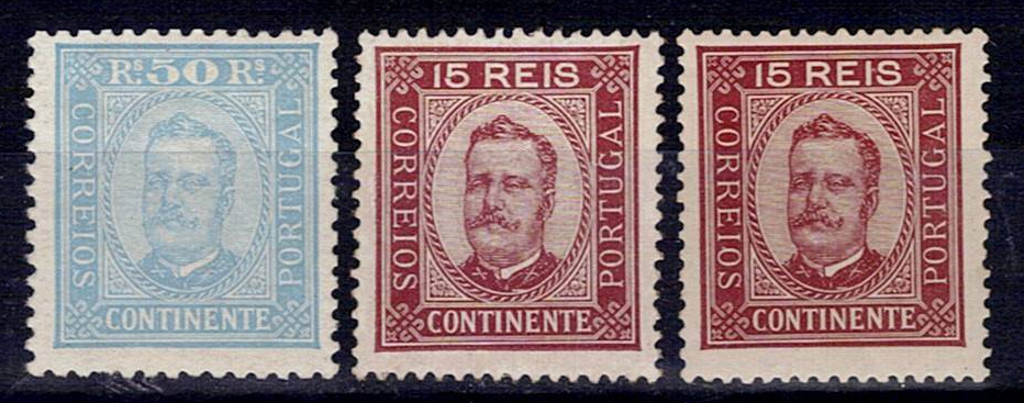 1518 imagePortugal 1892-1893 D. Carlos, Diogo Neto type. Set of 3 stamps Mf#71, of 50 reis on porcelain paper and perforation 12 3/4 + Mf#74, of 15 reis on porcelain paper and perforation 13.5 + Mf#74, of 15 reis on dotted paper and perforation 13.5 . New copies, with gum and hinge, in good color. Catalogue value €205.(Image 1)