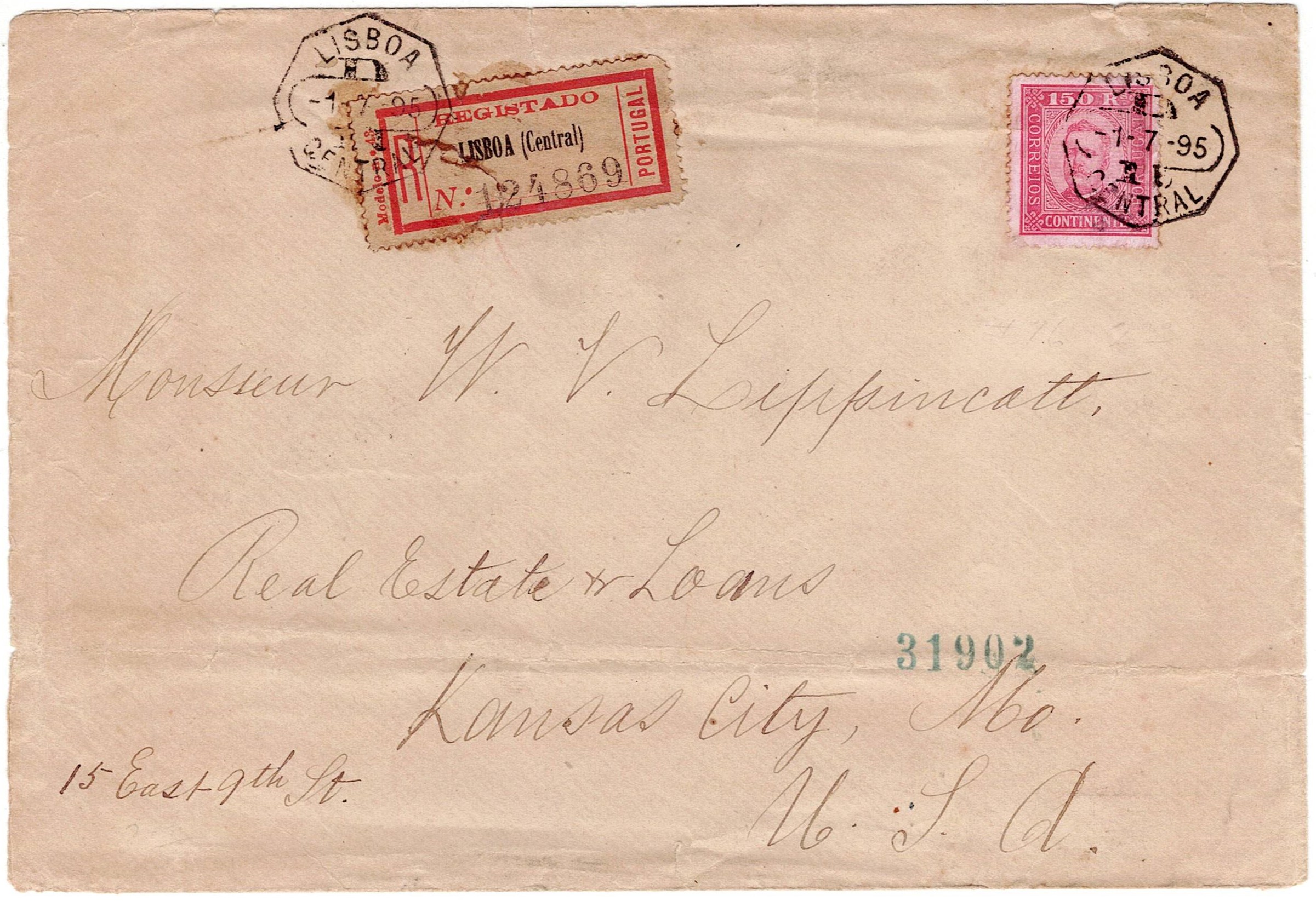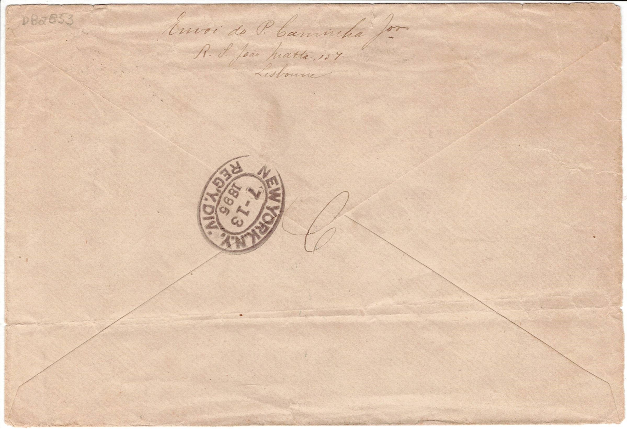 1520 imagePortugal 1892-93 D. Carlos I, Diogo Neto type. Registered letter sent from Lisbon on 1 July 1995, destined for Kansas City, USA, franked with a stamp of Mf#77a 150 reis carmine w/o pink, porcelain paper, perforation 13 ½. Stamp with 2 damaged corners. With transit postmark in New York, USA, on the reverse. Good.(Image 1) (Image 2)