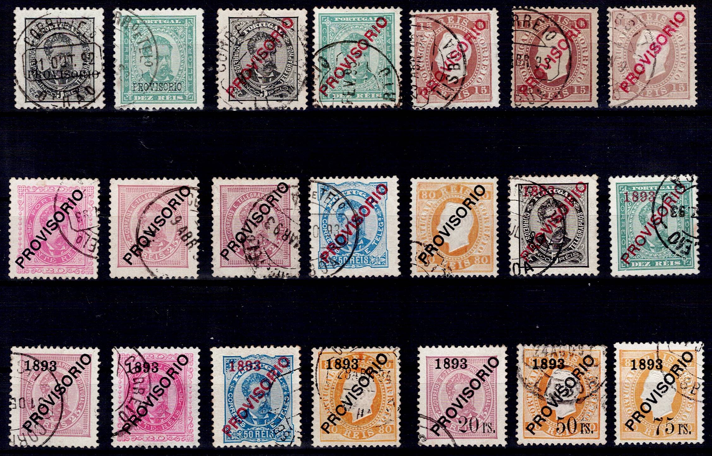 1522 imagePortugal 1892-93 – D. Luís I. “PROVISORIO” overprints. Complete series of 18 stamp values ​​MF#80-97 + 2 variants of stamp Mf#84, one on PLAIN paper with a 12 3/4 notch and the other on PORCELAIN paper with a 13.5 notch, with Mf#86 having a 12 3/4 notch. Used copies, of very good quality, without defects or repairs, in good color. Catalogue value €1,756.(Image 1)