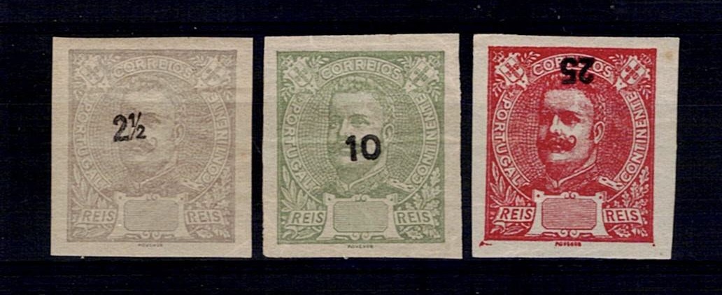 1525 imagePortugal 1895-1905 D. Carlos Mouchon. 3 non-perforated stamps, 2 of them with displaced overprint, 2.5 and 10 reis and 1 with displaced and inverted overprint, 25 reis carmine. Good.(Image 1)