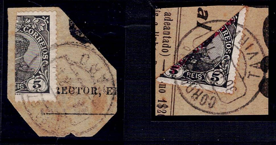 the 5 kings stamps Mf#127 and Mf#171 BIPARTIDOS, vertically and diagonally respectively. Copies stamped with circular postmarks dated from the Algarve "FARO" and "TAVIRA".(Image 1)