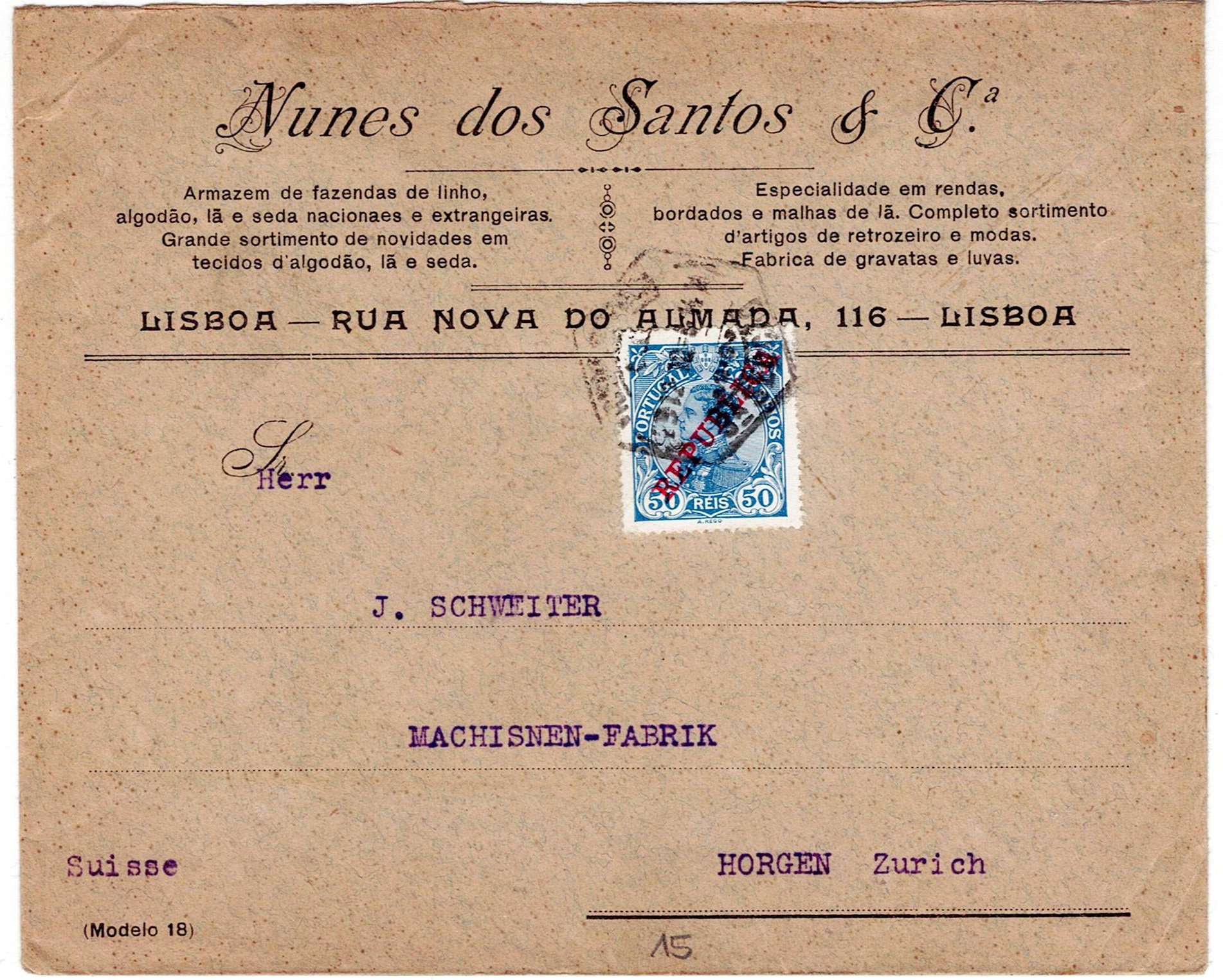 Portugal. Republic. Letter sent from Lisbon on 19.12.1912 to Zurich, postage 50 reis D. Manuel sc