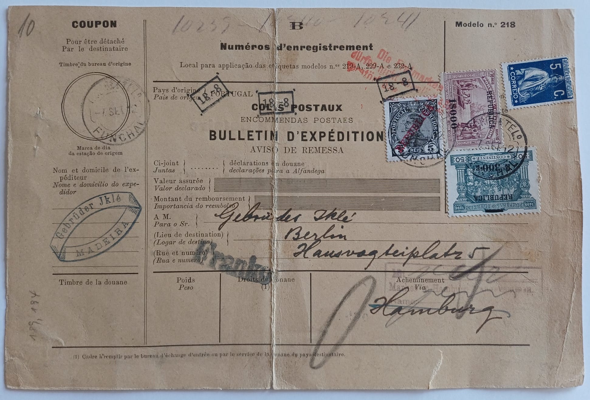 Portugal. Parcels. Printed dispatch bulletin for a postal parcel from Funchal on September 7, 1912, to