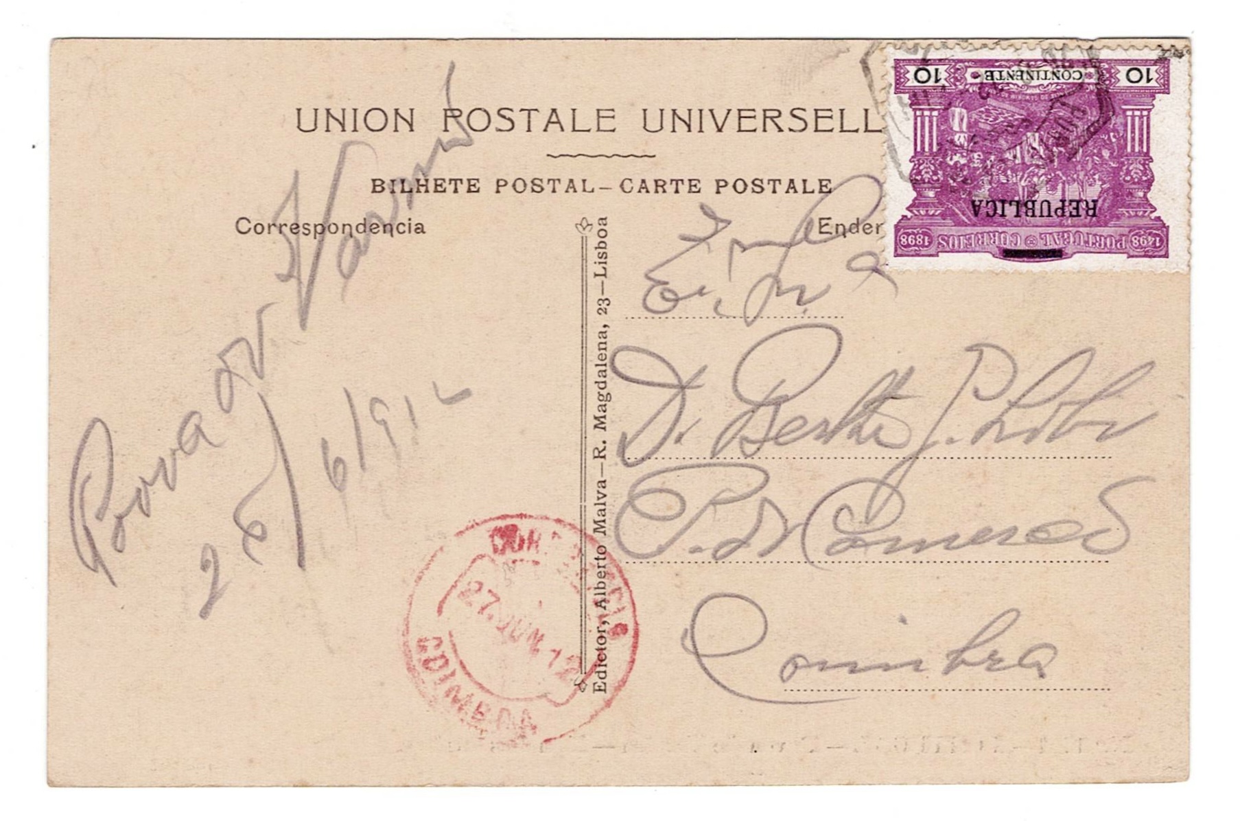 postage, with postage stamp from the 100th century of India, Republic, to Coimbra, arrival date in red (27.6.1912)(Image 1)
