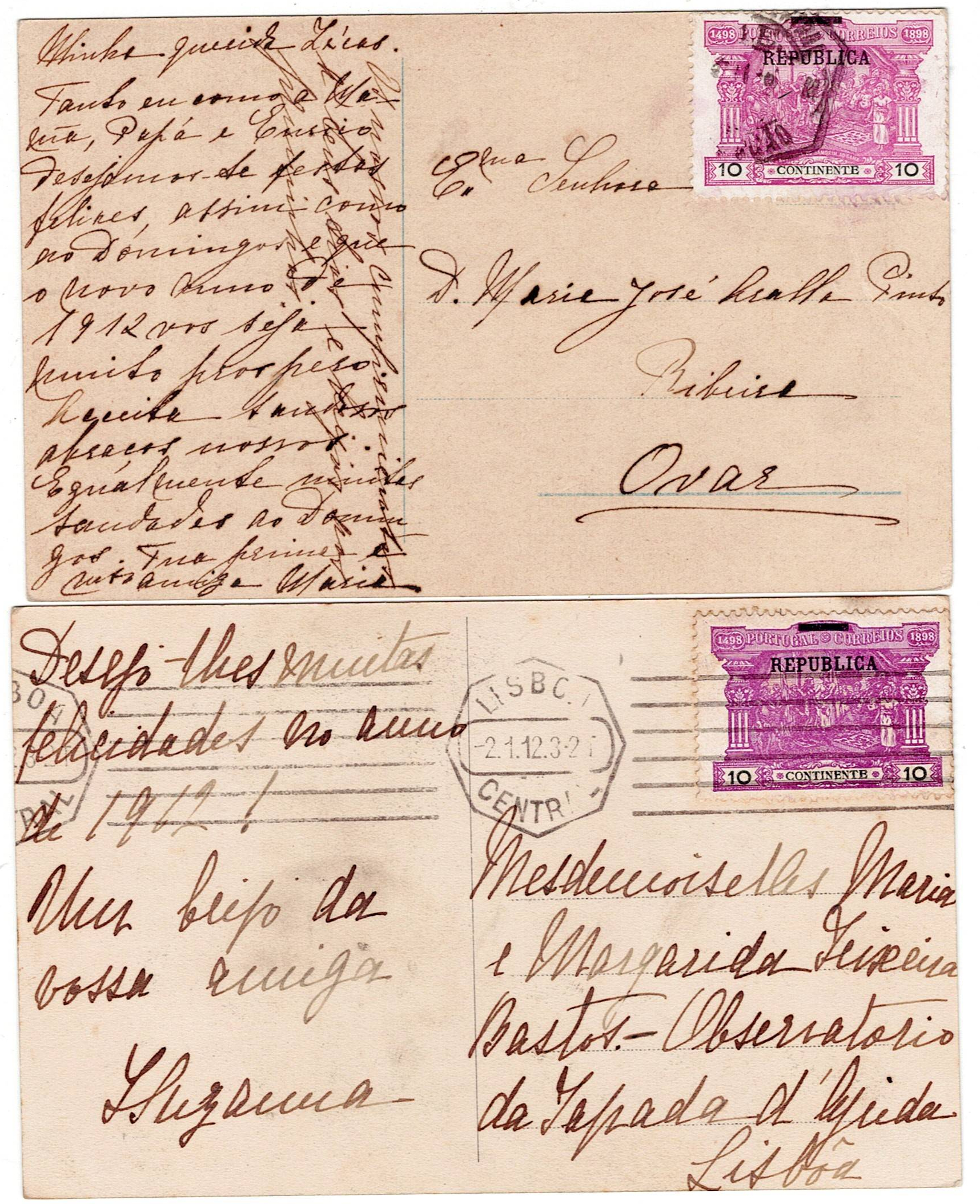Portugal. Two illustrated postcards, 10 reis postage, with a postage stamp bearing the word "REPUBLICA"