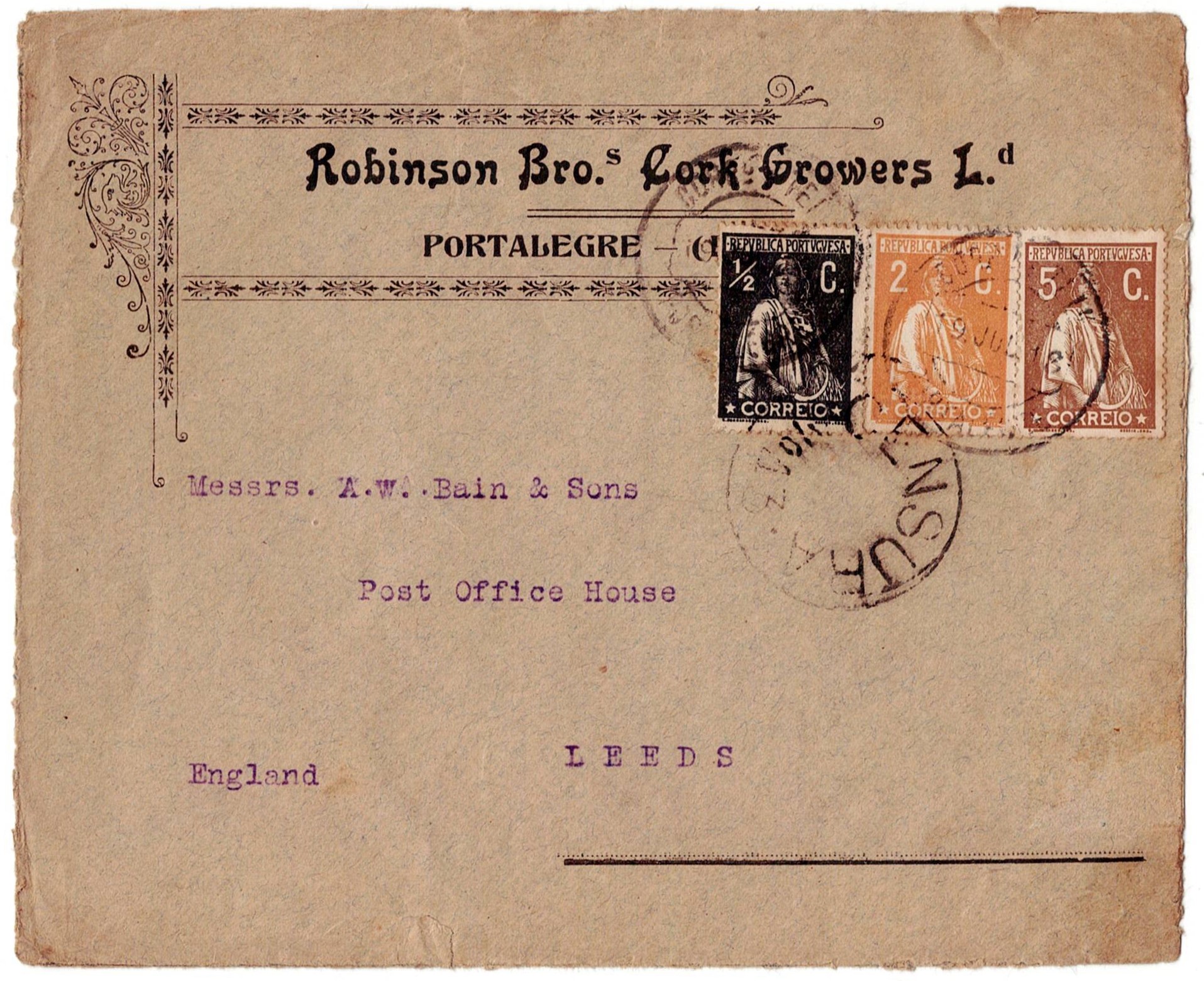 consisting of 2 cent CE#223 and 5 cent CE#227 stamps and ½ cent CE#207, to Leeds. It passed through censorship in Lisbon and was opened by censorship in England.(Image 1)