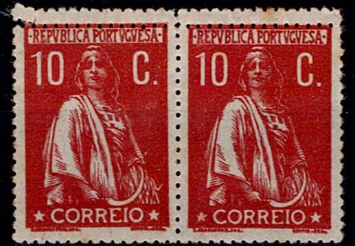 Portugal 1912 Ceres. Horizontal pair of Mf#215, 10th c., light brick, notched 15, with DOUBLE UPPER