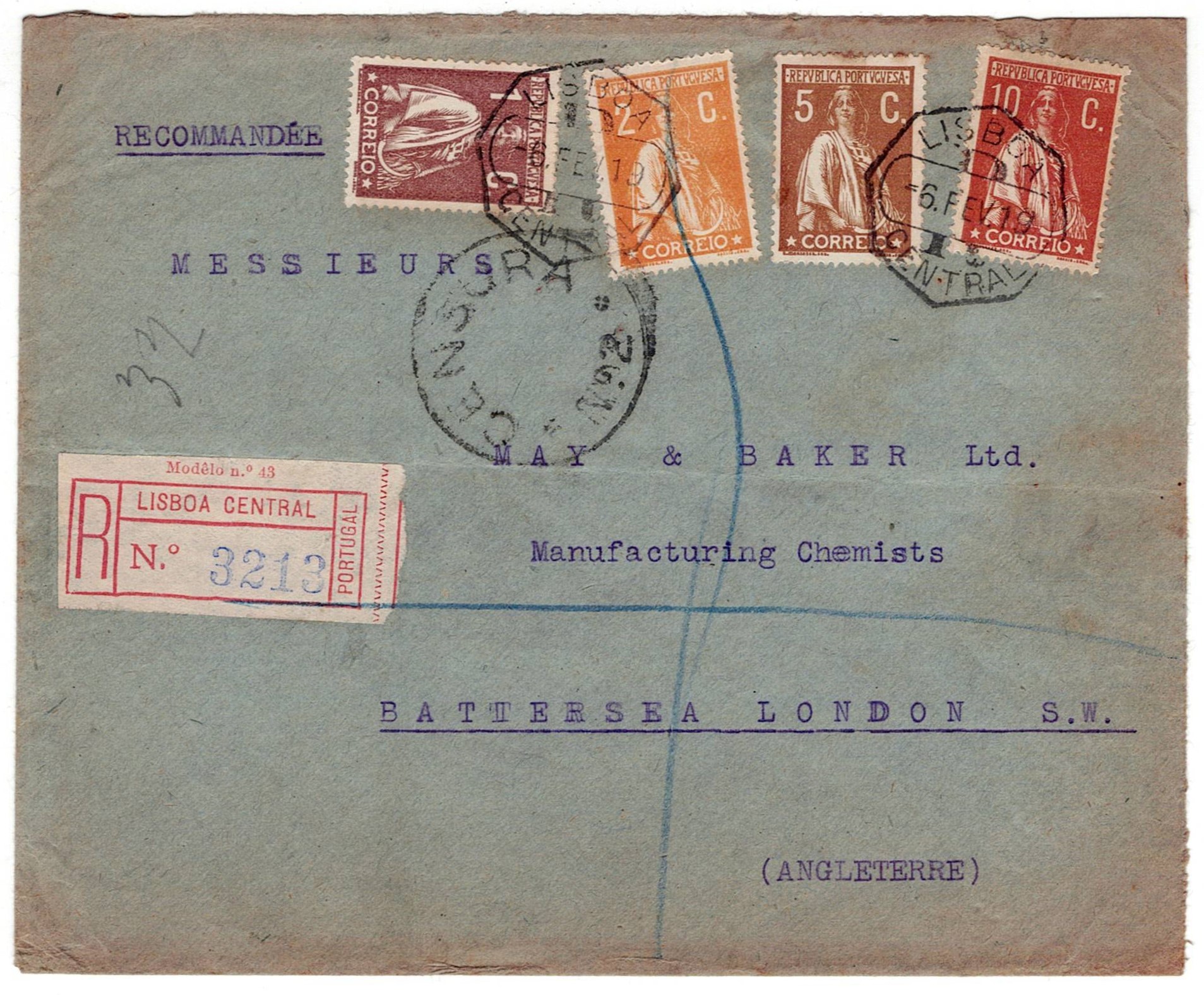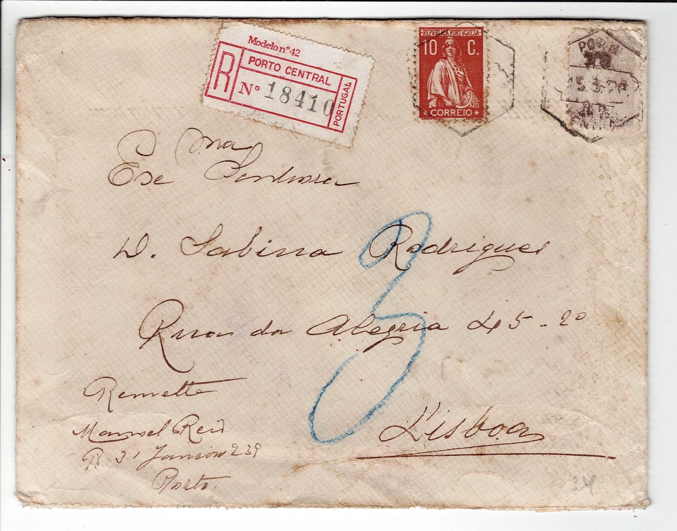 Postal history of Portugal. 1912. Ceres issue. Registered letter from Lisbon dated 6.2.1919, 18 cents