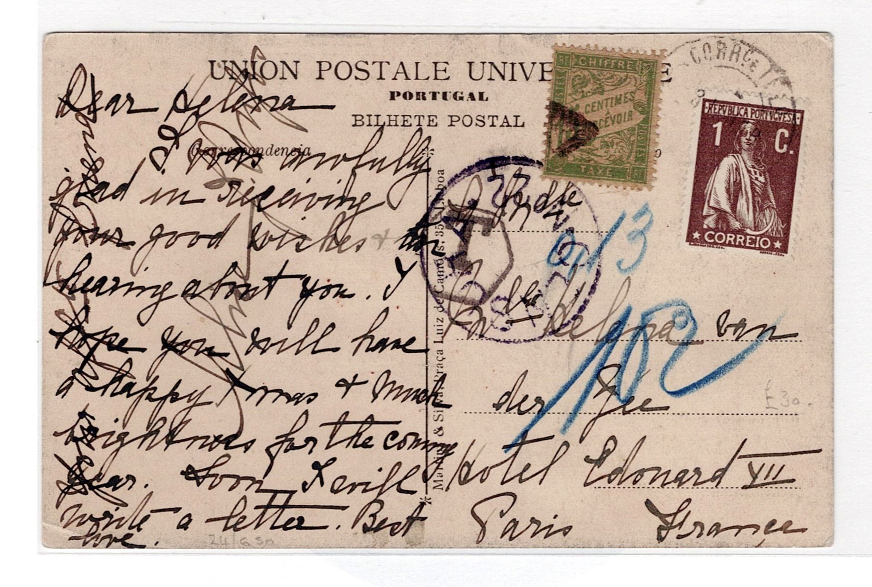 postage of 1 cent to Paris, postage stamped with a 15 centimes French stamp. Passed through censorship in Lisbon.(Image 1)