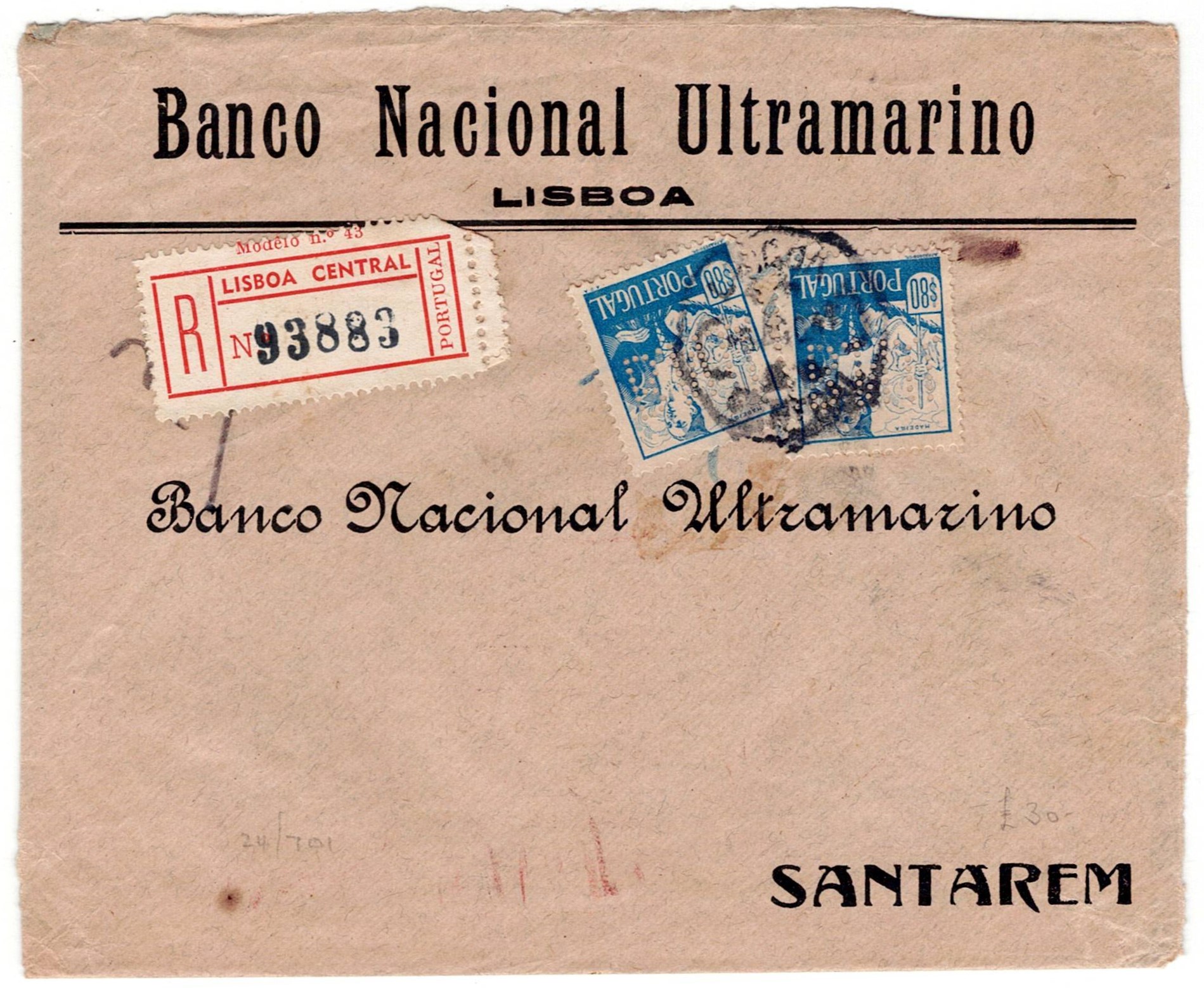 PERFINS. 1941. Registered letter from the Banco Nacional Ultramarino de Lisboa on 6.8, postage of 1$60